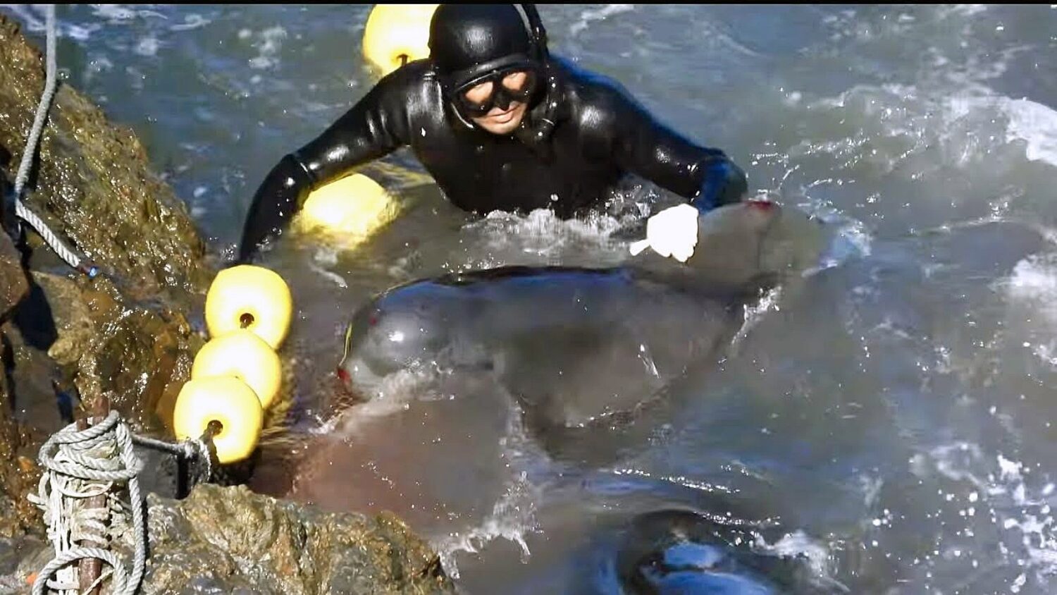 Then the killing begins. Divers swim out and grab individual animals and drag them bodily under tarps, set up specifically to prevent activists like Kunito from photographing the bloody killing of the animals.